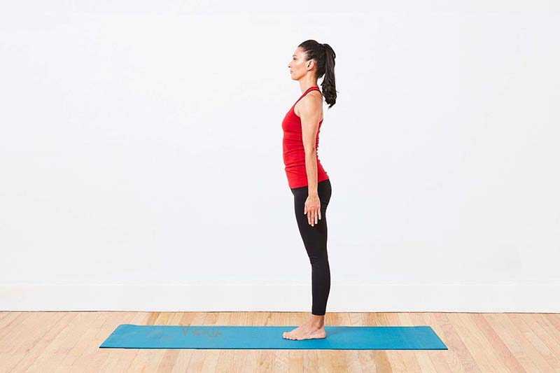 Bước 1: Đứng trên thảm tập với tư thế thẳng, hai chân rộng bằng vai, hai tay đặt song song với phần thân, lòng bàn tay nắm hờ.