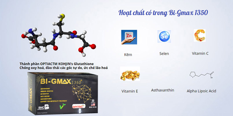 Bi-Gmax 1350 là một sản phẩm mà BNC medipharm xin phép Bộ Y tế nhập khẩu về Việt Nam lưu hành và phân phối. Bi-Gmax 1350 được người tiêu dùng đánh giá cao về chất lượng và được các bệnh viện uy tín tin dùng như bệnh viện Bạch Mai, Việt Đức, Thu Cúc, Nam học hiếm muộn, Da Liễu Trung Ương,… Vậy Bi-Gmax 1350 giá bao nhiêu và mua ở đâu là câu hỏi của nhiều người. Bi-Gmax 1350 giúp đào thải các gốc tự do, chống oxy hóa, giúp hạn chế quá trình lão hóa của cơ thể, trẻ hóa làn da, tăng cường sức đề kháng hỗ trợ vô sinh, hiếm muộn dùng cho người viêm gan cấp, mãn, tăng men gan, gan nhiễm mỡ, xơ gan, suy gan đang xạ trị điều trị hóa chất hoặc các thuốc các thuốc chữa ung thư, chống lao Sản xuất và nhập khẩu 100% từ Mỹ. Dưới đây chúng ta cùng đi tìm hiểu chi tiết hơn về sản phẩm này và nên mua ở đâu.