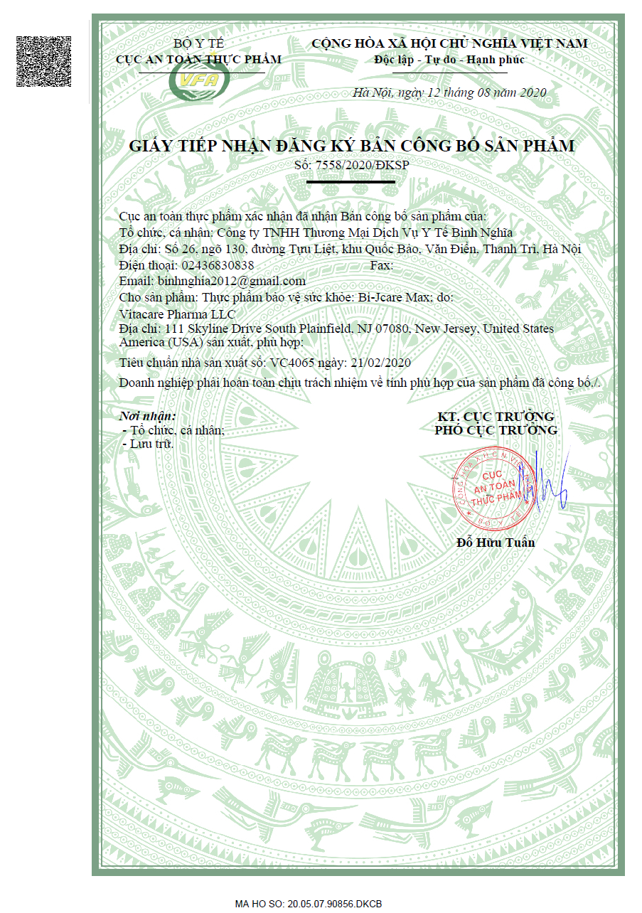 Bi-Jcare Max là một giải pháp tổng thể và toàn diện, đột phá trong phòng và điều trị các bệnh lý về xương khớp. Đây là một công thức đặc biệt được nghiên cứu bởi đội ngũ các nhà khoa học về dược lý của hãng dược phẩm nổi tiếng VitaCare Pharma Inc. của Hoa Kỳ, để đáp ứng nhu cầu của xã hội về một sản phẩm phòng, điều trị, chăm sóc và bảo dưỡng hệ xương khớp một cách toàn diện. Bi-Jcare Max đã được đăng ký bản quyền thương hiệu giữa các nhà khoa học của Hãng VitaCare Pharma Inc, Hoa Kỳ và nhà phân phối BNC Medipharm. Sản phẩm đã được Bộ Y Tế Việt Nam cấp giấy phép nhập khẩu với số Đăng Ký Công Bố Sản Phẩm: 7558/2020/ĐKSP. Với sự có mặt của các hoạt chất sinh học được chiết xuất từ thảo dược và nguyên liệu có nguồn gốc tự nhiên như: Glucosamin, Chondroitin, MSM, Hyaluronic Acid, Hydrolyzed Collagen Type-I (Peptan),Undenatured Collagen Type-II (UCII), Boswellia Ext, Bromelain, Devils Claw Root, Ginger Root, Turmeric Root Ext.Calcium, Vitamin D3 và Sodium với độ tinh khiết và sinh khả dụng cao có trong Bi-Jcare Max đã tạo ra một sản phẩm hoàn hảo với các tác dụng hợp đồng, phổ rộng để giải quyết một cách triệt để các vấn đề mà hệ xương khớp đối mặt hàng ngày như thoái hoá sụn khớp, khô chất nhờn, viêm cấp và mãn, loãng xương, khắc phục các tình trạng bệnh lý của xương khớp, kiến tạo, tăng cường và chăm sóc sức khỏe hệ xương khớp một cách an toàn và hiệu quả.