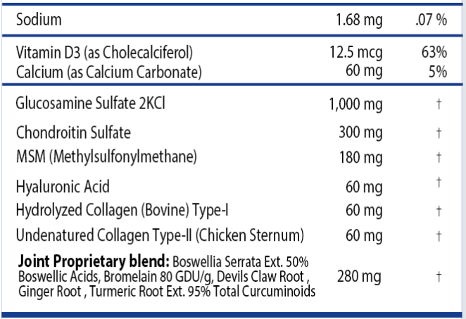 Chondroitin, MSM, Hyaluronic Acid, Hydrolyzed Collagen Type-I (Peptan), Undenatured Collagen Type-II (UCII), Boswellia Ext, Bromelain, Devils Claw Root, Ginger Root, Turmeric Root Ext.