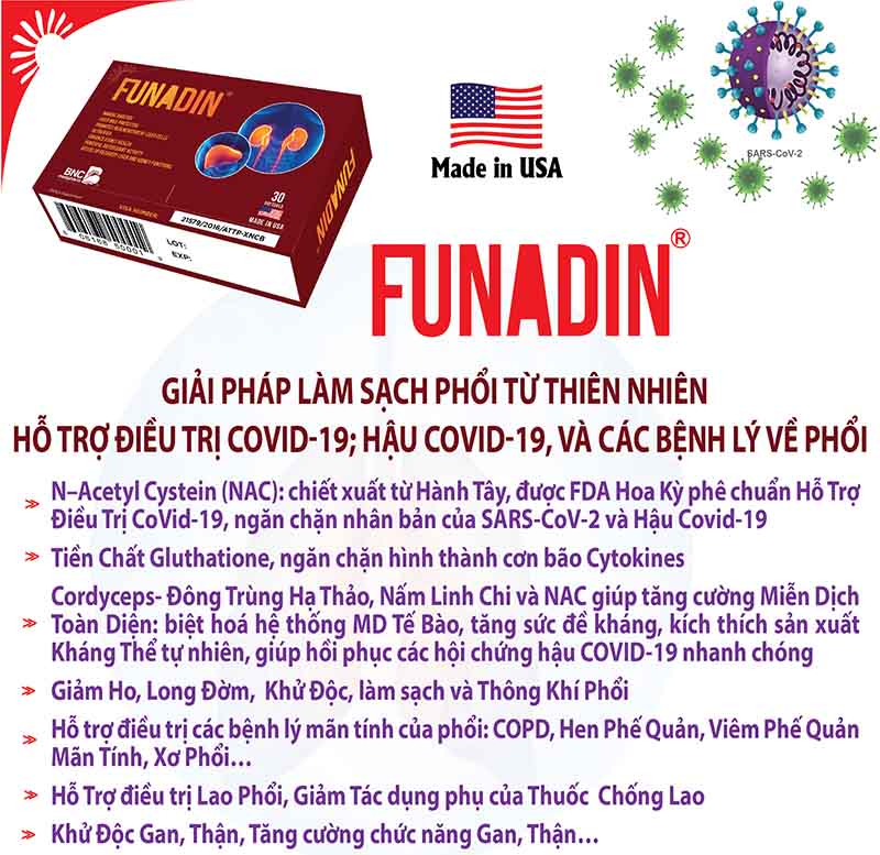 Funadin là sự kết hợp giữa các thảo dược quý hiếm, các chất chống oxy hoá, khử gốc tự do và các chất dinh dưỡng đặc hiệu như albumin, globulin miễn dịch, proteins, các axit amin cần thiết được phân đoạn, chiết xuất ở cấp độ phân tử ADN từ gan tươi và gan sấy khô cung cấp đầy đủ toàn diện các chất dinh dưỡng giúp cải thiện chức năng gan, thận và phổi. Funadin® với các tinh chất dinh dưỡng hoàn toàn tự nhiên nhằm mục tiêu nuôi dưỡng, bảo vệ chức năng gan, thận và phổi, duy trì hoạt động khoẻ mạnh của các tế bào Kupffer, tế bào gan, tiểu cầu thận và làm trẻ hóa các mô chức năng giúp phòng ngừa, cải thiện, hỗ trợ hiệu quả điều trị các bệnh lý cả gan, thận và phổi. Funadin đã chứng tỏ được kết quả tuyệt vời khi dùng để điều trị các bệnh rối loạn về chức năng gan, thận và phổi do ô nhiễm không khí, môi trường, rượu bia, ma túy và các chất độc hại khác trong thuốc hay thực phẩm. Đặc biệt trong hỗ trợ điều trị hội chứng gan - thận, một trong những điều quan trọng của chế độ ăn uống đúng tiêu chuẩn để giữ gìn sức khỏe cho gan và thận là cung cấp đầy đủ chất đạm giúp tái tạo tế bào T, các chất khoáng, interferons, globulins đây là yếu tố để bảo vệ cơ thể, chống nhiễm trùng, tăng cường hệ thống miễn dịch, tăng sức tự đề kháng cho cơ thể, đặc biệt quan trọng trong việc hỗ trợ điều trị và phòng ngừa, chống lây lan dịch cúm CoVid 19 đang lan tràn trên toàn thế giới....