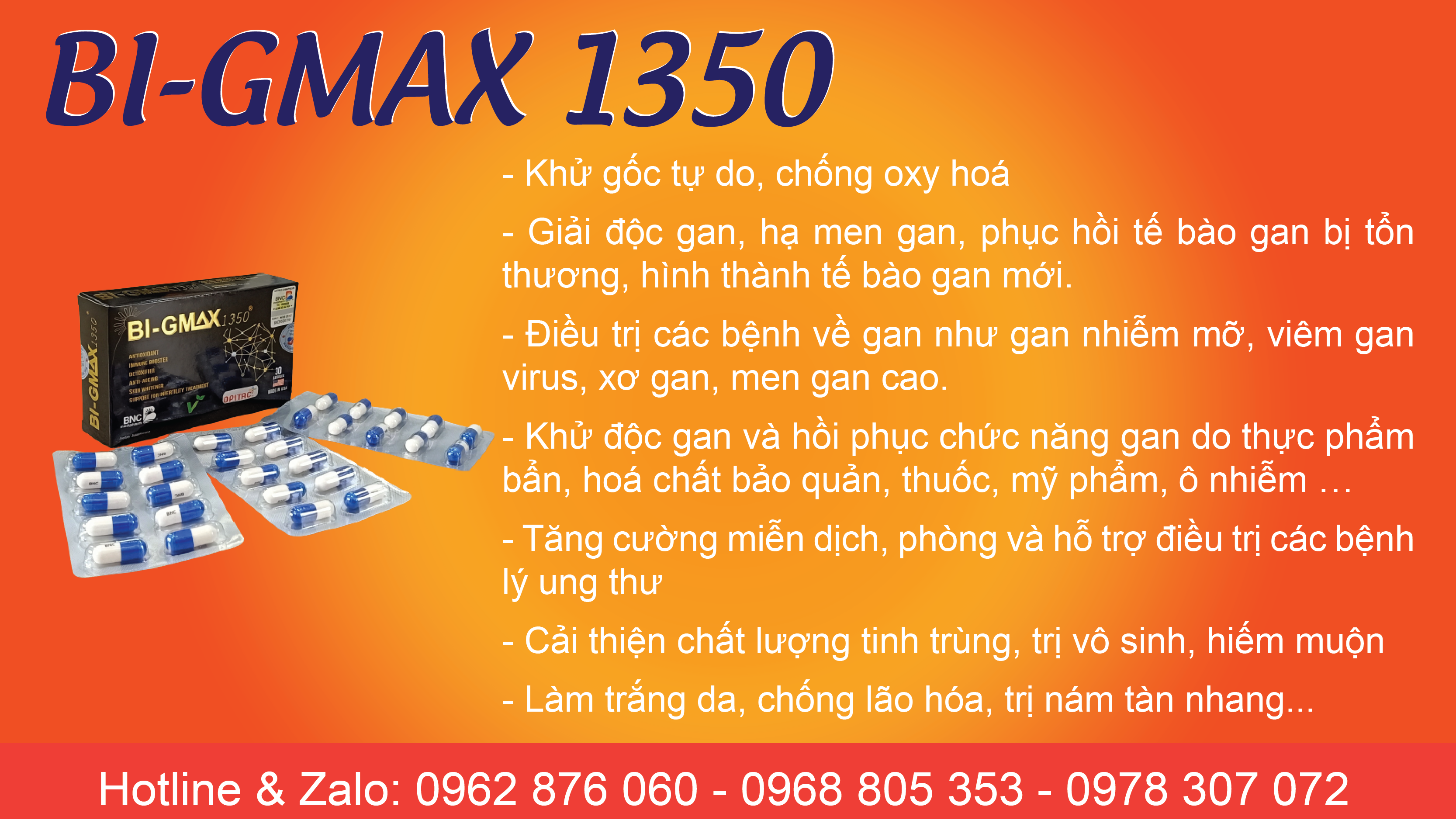 Bi-Gmax 1350 - Hỗ trợ giúp chống oxy hóa, đào thải các gốc tự do, giúp hạn chế quá trình lão hóa của cơ thể, tăng cường sức khỏe. Giúp tăng cường khả năng giải độc, bảo vệ gan, thận, phổi và hệ miễn dịch trước các gốc tự do…