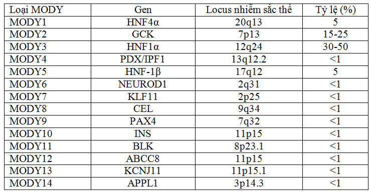 Đái tháo đường khởi phát ở tuổi trưởng thành (MODY) là một nhóm các rối loạn đơn gen không đồng nhất, xảy ra do rối loạn chức năng tế bào, thường xảy ra <25 tuổi, không phụ thuộc insulin và chiếm 1-5% số bệnh nhân đái tháo đường. Đến nay, 14 gen dẫn đến MODY đã được xác định (Firdous P, 2018 [4]) (Bảng 5).