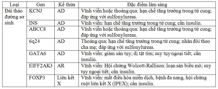 Đái tháo đường sơ sinh cũng là một loại đái tháo đường đơn gen, có thể được chẩn đoán từ lúc sinh ra đến 6 tháng tuổi, trong khi đái tháo đường loại 1 hiếm khi gặp ở bệnh nhân trước 6 tháng tuổi. 20 gen khác nhau có thể gây ra hai thể đái tháo đường sơ sinh là thể thoáng qua (transient) hoặc là thể vĩnh viễn (permant) (Bảng 6).