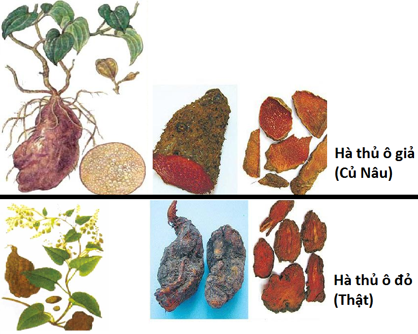 + Nhận biết Hà thủ ô đỏ: Hà Thủ Ô hay Hà Thủ Ô đỏ, vì nó có sắc đỏ, cũng để tránh nhầm với cây Hà Thủ Ô trắng (Streptocaulon juventa) (Lour), Merr, họ Thiên Lý Asclepiadaceae. Hà thủ Ô đỏ, còn gọi là “giao đằng”, là cây dây, ý nói thứ dây này luôn luôn quấn vào nhau, hay “dạ hợp”, dạ là đêm, ý nói ban đêm chúng quấn lấy nhau. Vị thuốc là rễ hay dây của cây Hà Thủ Ô Polygonum multiflorum Thunb, tên mới, hiện nay: Fallopia multiflora, họ rau răm Polygonaceae.