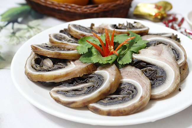 Vớt tai heo cuộn mộc nhĩ ra để nguội. Bọc lại rồi để ngăn mát tủ lạnh 3 giờ đồng hồ là được. Khi ăn, đem tai heo cắt bỏ dây, thái miếng mỏng vừa phải. ăn kèm với tương ớt hoặc chanh muối.