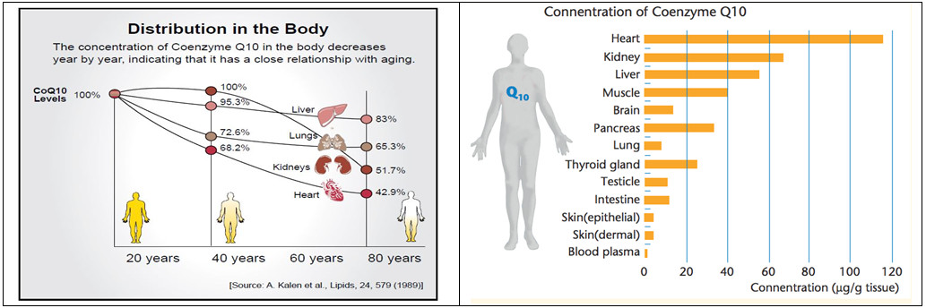 Đây là hai chức năng chính của Co-Q10 được ứng dụng trong điều trị các bệnh lý lâm sàng. Hơn nữa, các nghiên cứu gần đây cho thấy ảnh hưởng của CoQ10 trên các bệnh lý về gen liên quan đến chuyển hoá, dẫn truyền tín hiệu, và vận chuyển của tế bào ở người, như thiếu hụt CoQ10 gây ra đột biến gen lặn ở NST thường, bệnh lý ty thể, lão hoá, tấn công của gốc tự do, tiến triển của ung thư, và cũng là tác dụng phụ của sử dụng thuốc Statin trong điều trị cao cholesterol. Rất nhiều các rối loạn thoái hóa thần kinh, tiểu đường, ung thư, đau xơ cứng cơ, cơ bắp và các bệnh tim mạch liên quan với mức CoQ10 thấp. CoQ10 hấp thụ tốt qua đường uống và được phân bố rộng rãi ở các mô, không gây tác dụng phụ nên đem đến nhiều lợi ích toàn diện. Sự phân bố Co-Q10 trong cơ thể và bị giảm dần theo tuổi tác được thể hiện như trong các đồ thị dưới đây: