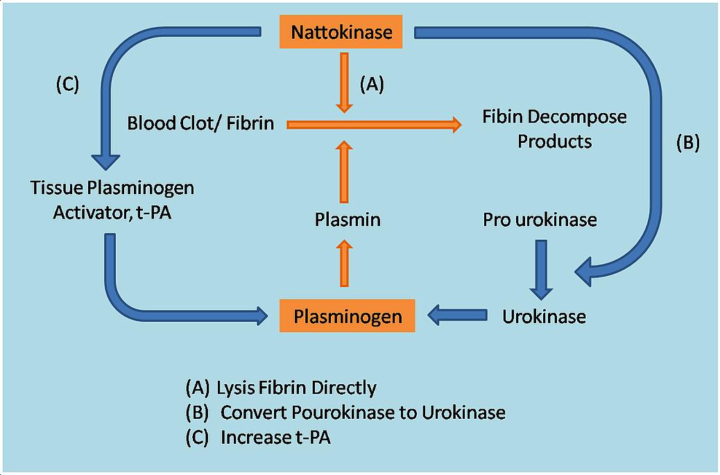 Cơ chế hoạt động của Nattokinase: tác dụng chọn lọc, chỉ làm giảm hàm lượng fibrinogen và phân hủy các sợi nhánh fibrin theo 3 cơ chế: