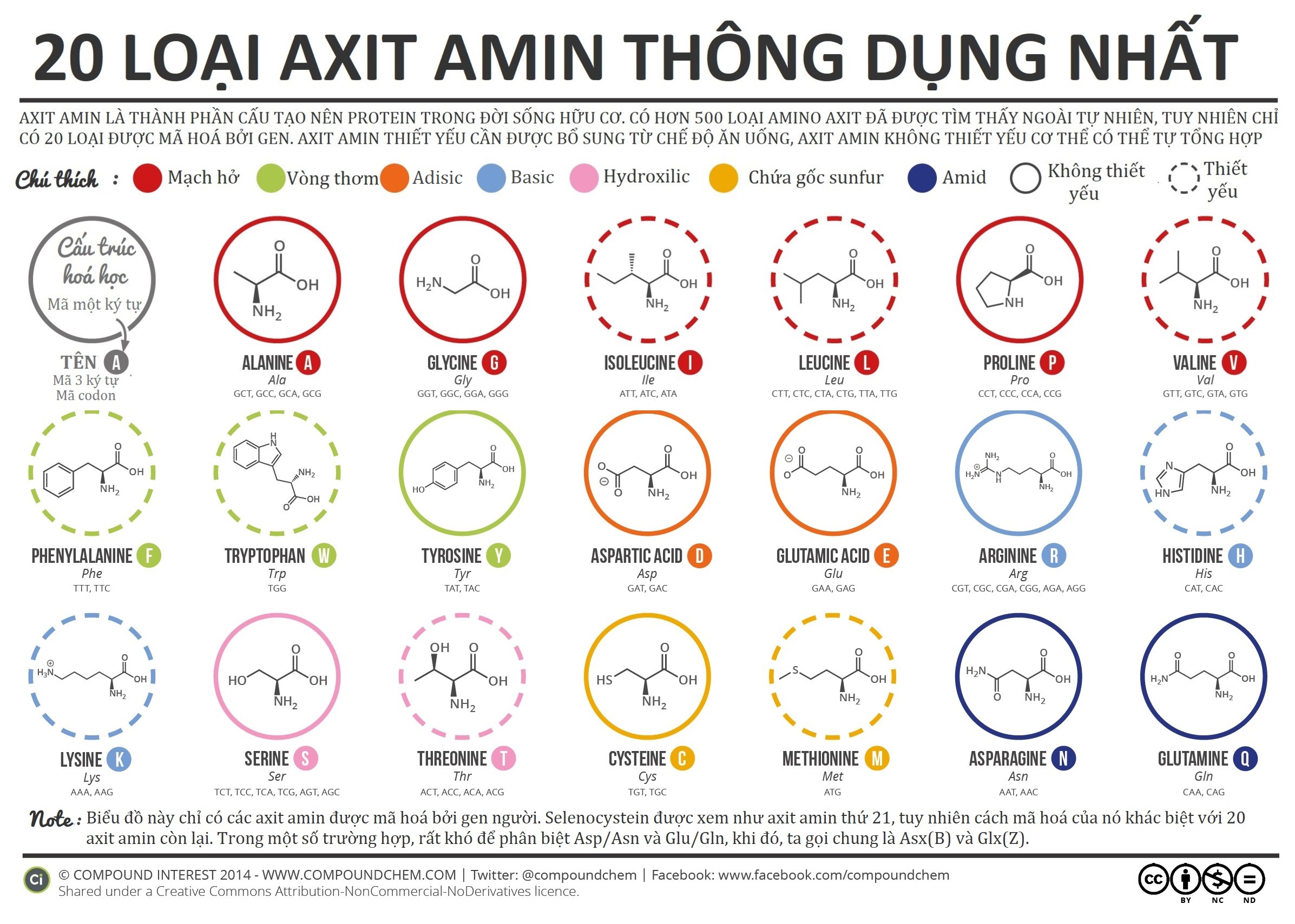 Axit amin là thành phần thiết yếu tồn tại phổ biến ở các sinh vật sống, từ vi sinh vật đến con người. Như chúng ta đã biết, axit amin là thành phần chính cấu tạo nên protein (chất đạm). Các axit amin là một thành tố không thể thiếu trong cơ thể và chế độ ăn của con người. Axit amin còn đóng vai trò quan trọng trong việc duy trì hoạt động sống của cơ thể. Có khoảng 500 loại axit amin được tìm thấy trong tự nhiên nhưng chỉ có 20 loại tham gia cấu thành nên protein trong cơ thể con người. Dưới đây chúng ta cùng đi tìm hiểu chi tiết về các loại axit amin.