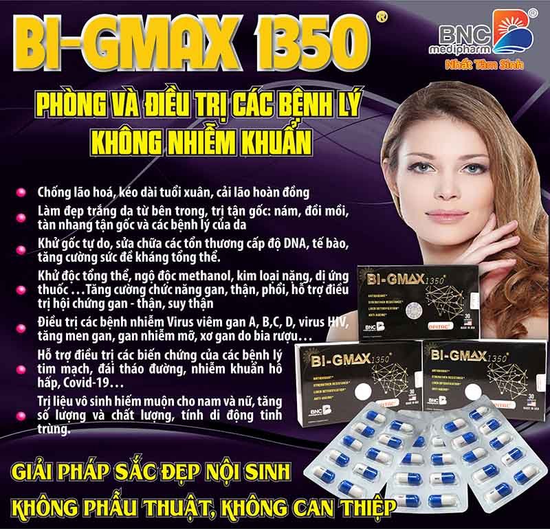 Bi-GMAX 1350 là công thức kết hợp cộng hưởng của các siêu cường chống oxy hóa và các gốc tự do chính của cơ thể giúp cơ thể dọn sạch các gốc tự do, sửa chữa các tổn thương tế bào cấp độ DNA, làm chậm quá trình lão hóa, tăng cường miễn dịch và bảo vệ cơ thể khoẻ mạnh.